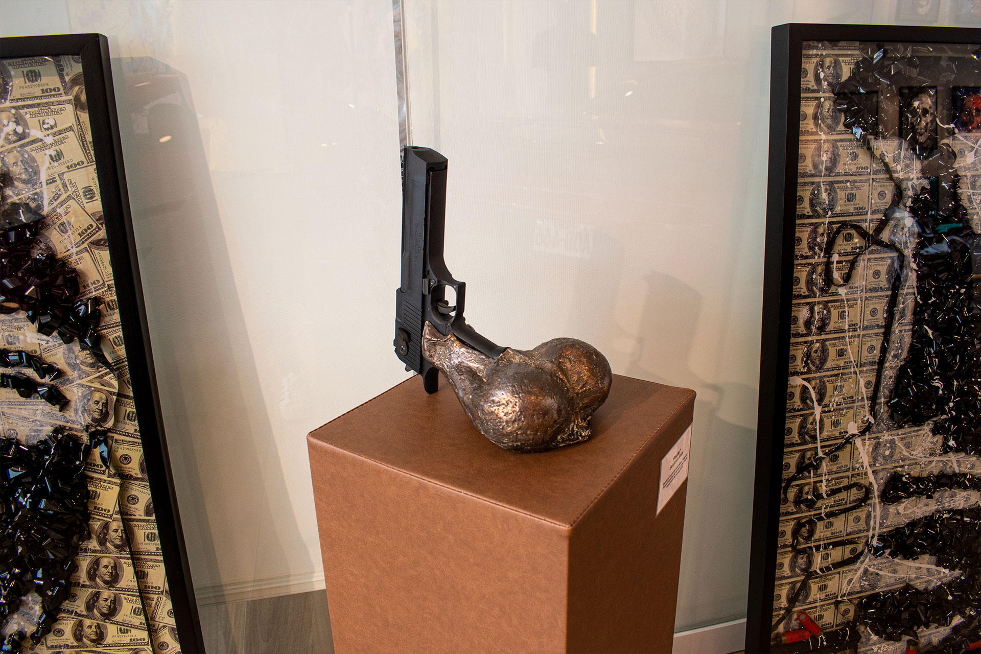 Black steel 0.50 Magnum Desert Eagle automatic pistol sculpture on bronze base. Germany. 2019.