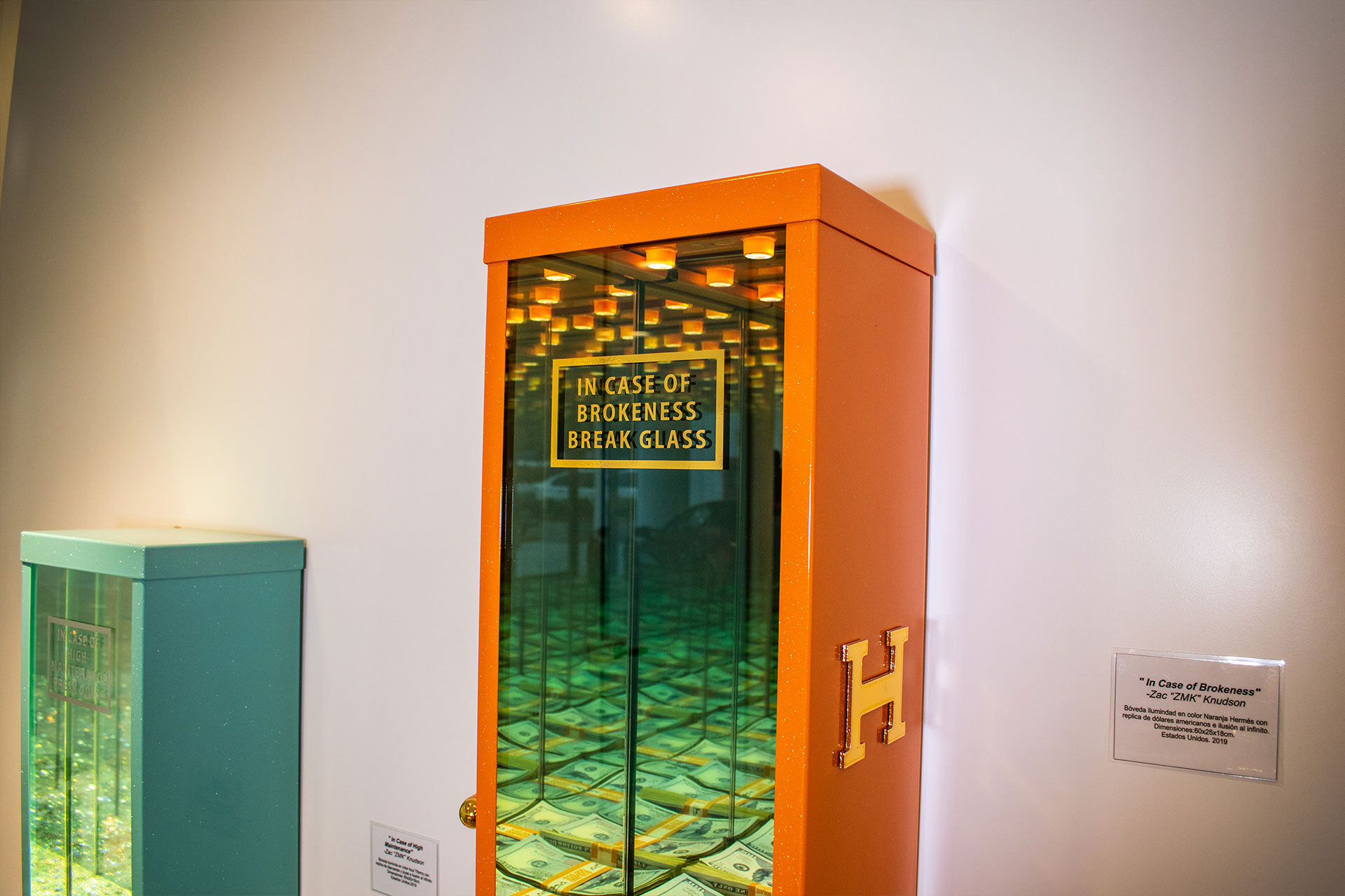 Bóveda iluminada en color Naranja Hermès con replica de dólares americanos e ilusión al infinito. Dimensiones: 60x25x18cm. Estados Unidos. 2019.