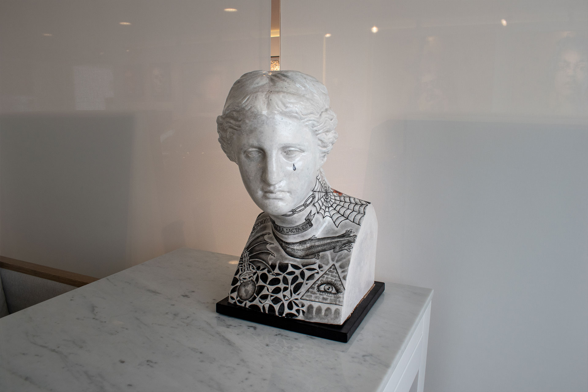 Escultura hecha en polvo de mármol tatuada con pigmentos especiales. La simbología de los tatuajes habla sobre el fin del mundo ALEA IACTA EST significa “ la suerte está echada”. Dimensiones: 55x30x30cm